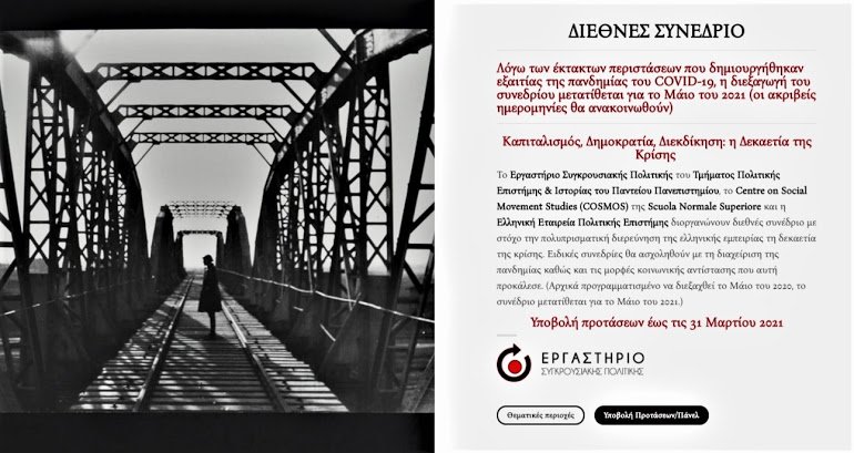 Το Εργαστήριο Συγκρουσιακής Πολιτικής του Τμήματος Πολιτικής Επιστήμης & Ιστορίας του Παντείου Πανεπιστημίου το Centre on Social Movement Studies της Scuola Normale Superiore και η Ελληνική Εταιρεία Πολιτικής Επιστήμης διοργανώνουν διεθνές συνέδριο με στόχο την πολυπρισματική διερεύνηση της ελληνικής εμπειρίας (https://lcp.panteion.gr/%ce%b4%ce%b9%ce%b5%ce%b8%ce%bd%ce%b5%cf%82-%cf%83%cf%85%ce%bd%ce%b5%ce%b4%cf%81%ce%b9%ce%bf/), που θα διεξαχθεί στο Πάντειο Πανεπιστήμιο τον Οκτώβριο του 2020 (οι ακριβείς ημερομηνίες θα ανακοινωθούν σύντομα). Υπό το φως του ότι, με πολλούς τρόπους, η Ελλάδα υπήρξε προάγγελος και συμπύκνωση εξελίξεων σε ολόκληρη την Ευρώπη, η λεπτομερής και θεωρητικά ενσυνείδητη εξερεύνησή της παρέχει τις βάσεις για την προβληματοποίηση και ενδελεχή διερεύνηση υπαρχουσών εννοιών και θεωρητικών αντιπαραθέσεων στην τομή θεσμικής και συγκρουσιακής πολιτικής με πρόδηλες ‒συγκριτικές-θεωρητικές‒ προεκτάσεις για ολόκληρη τη σύγχρονη πολιτική κοινωνιολογία. Οι γνωστικοί στόχοι επιμερίζονται σε τρεις βασικούς τομείς: (α) την επισταμένη αποτίμηση του χαρακτήρα και των κοινωνικών επιπτώσεων της κρίσης· (β) την επίδρασή της στη λειτουργία του πολιτικού συστήματος και στους τρόπους με τους οποίους αυτή επέτεινε τη διαδικασία της μετα-δημοκρατικής συρρίκνωσης· και (γ) τις κοινωνικές-κινηματικές και πολιτικές αντιστάσεις που προκάλεσε.